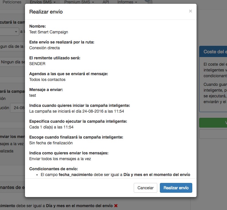 Los condicionantes de envío nos permiten escoger de forma automática y dinámica a que contactos se les enviará el SMS cada vez que se ejecute la campaña inteligente. En el momento de ejecución de la campaña, se buscará que contactos en ese momento cumplen los condicionantes creados, y se les enviará el SMS.