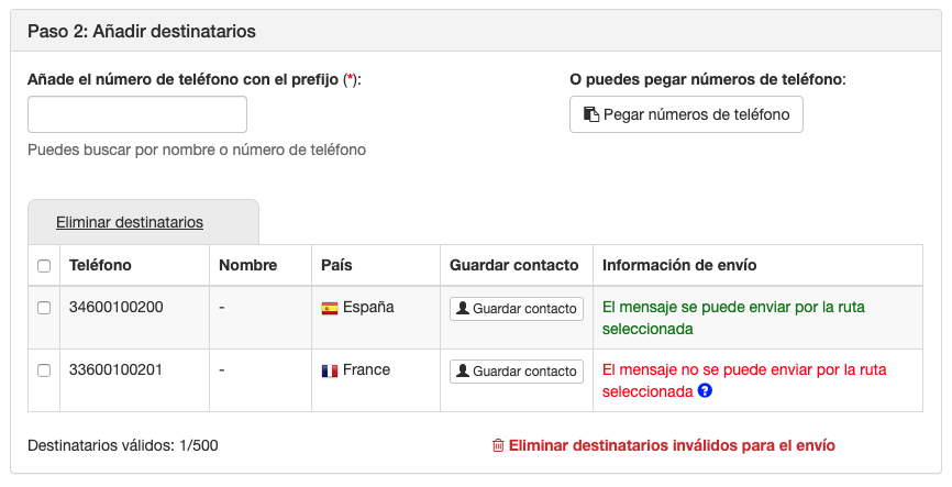 En la captura, la ruta seleccionada solo dispone de envíos para España, los envíos a Francia no están permitidos. En este caso, puedes seleccionar una ruta que permita enviar SMS a Francia o eliminar el destinatario francés, ya que la ruta escogida no permite envíos a Francia en este caso. Una vez hayas escogido los destinatarios del envío, si no son contactos guardados, podrás guardarlos en tus contactos pulsando el botón 'Guardar contacto'.