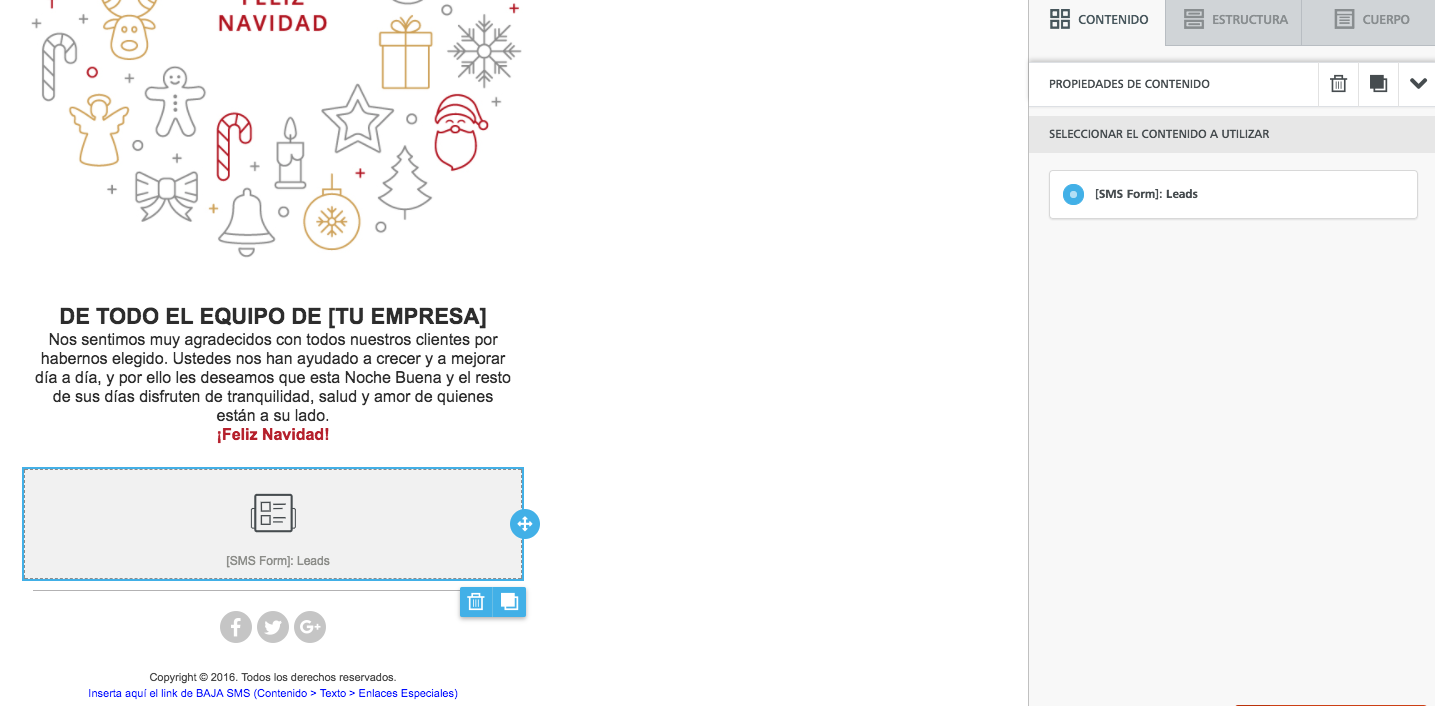 Pulsa sobre el botón de 'Enlaces especiales', 'Formulario de Baja SMS' y finalmente pulsa en 'No deseo recibir más publicidad por SMS' para añadir el enlace de baja a tu Landing.